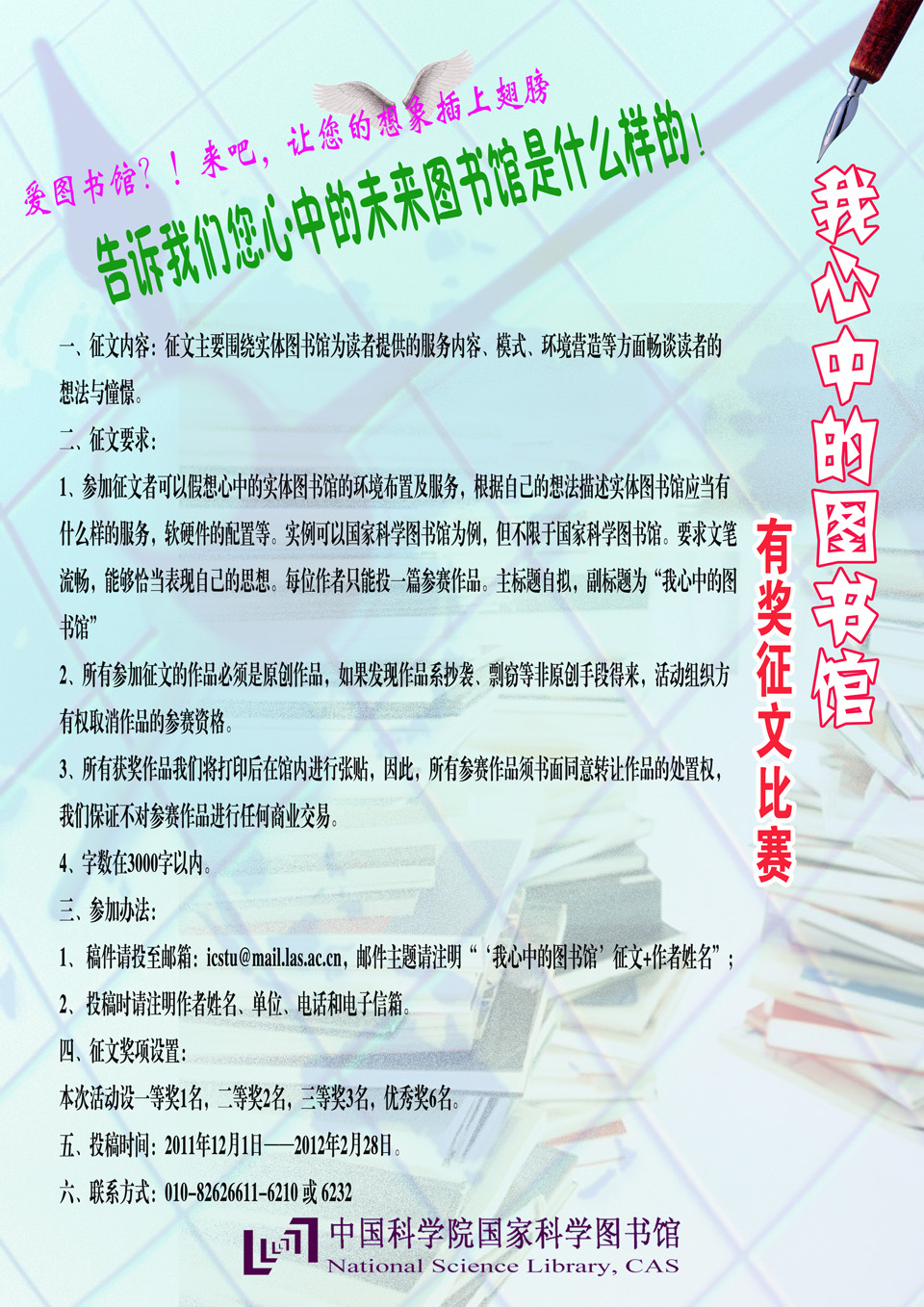1、参加征文者可以假想心中的实体图书馆的环境布置及服务,根据自己的想法描述实体图书馆应当有什么样的服务,软硬件的配置等。实例可以国家科学图书馆为例,但不限于国家科学图书馆。要求文笔流畅,能够恰当表现自己的思想。每位作者只能投一篇参赛作品。主标题自拟,副标题为“我心中的图书馆”