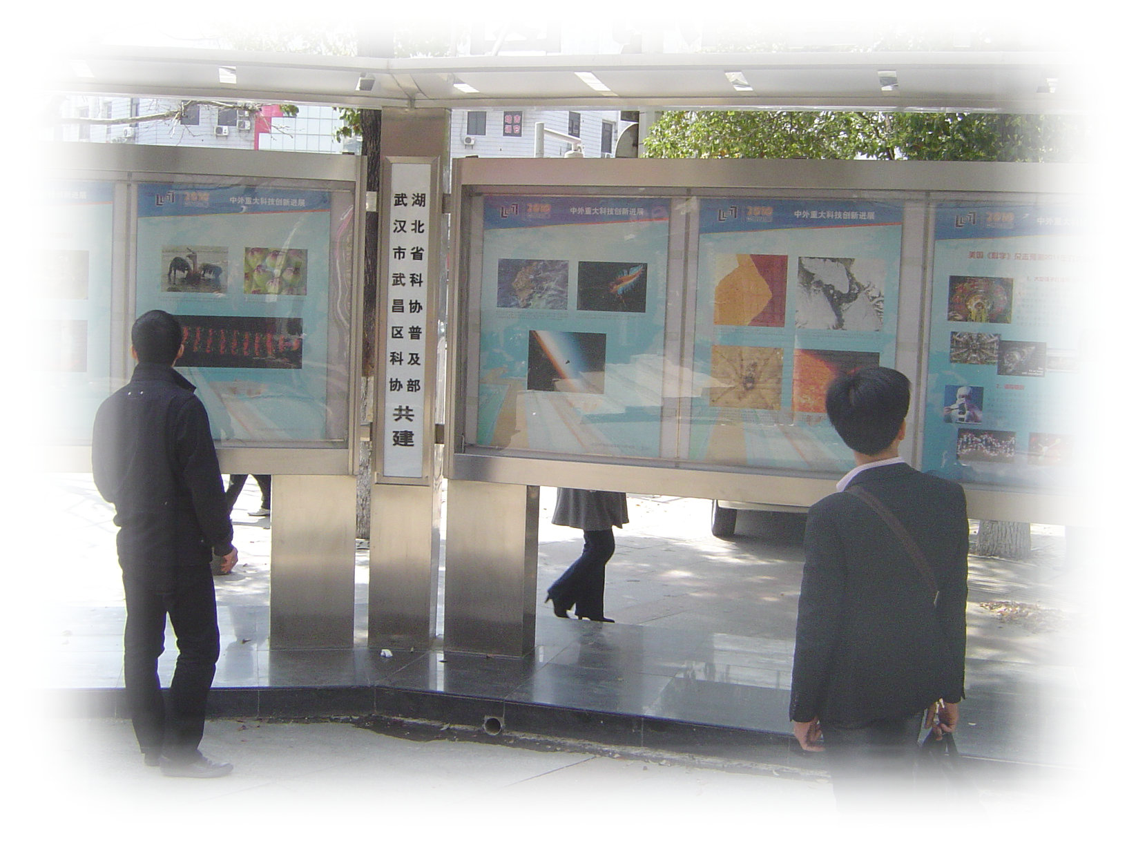 图片展示橱窗处于水果湖繁华的街区,附近聚集了大量政府机关企事业团体和中小学校,街区人流量大,平均每天超过2万人,展览受到附近单位工作人员以及武汉市民的积极响应,参观者络绎不绝,反响热烈,深受欢迎。
